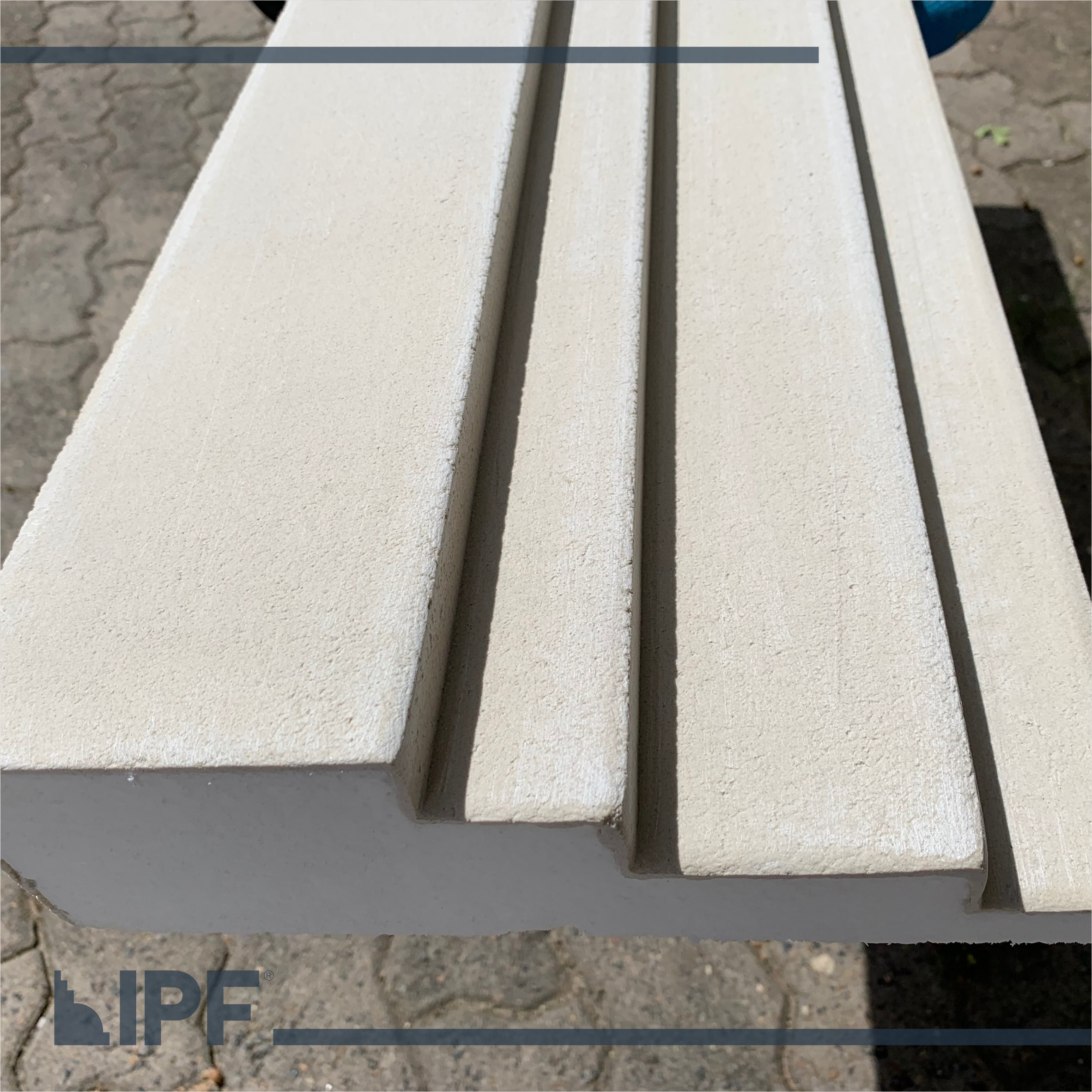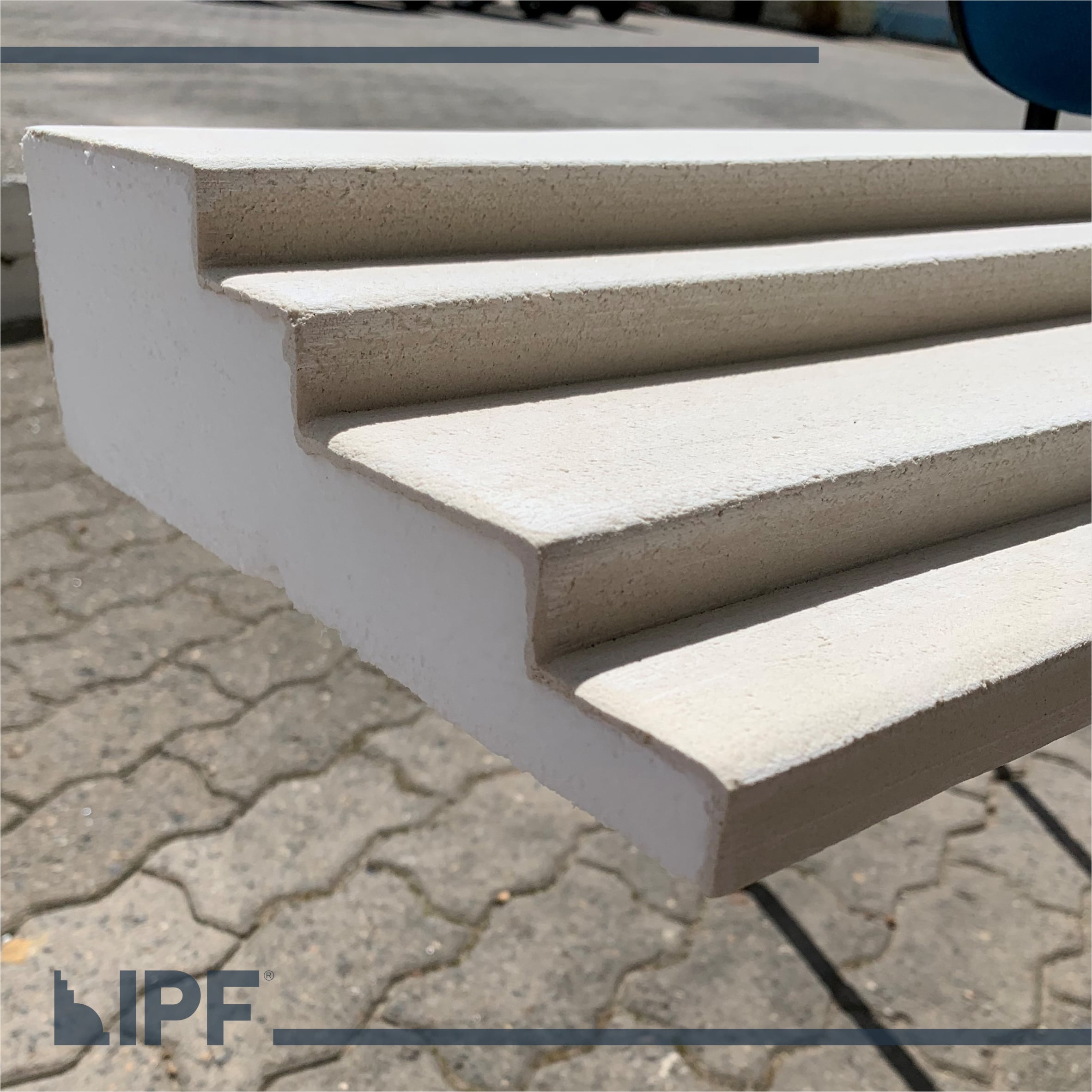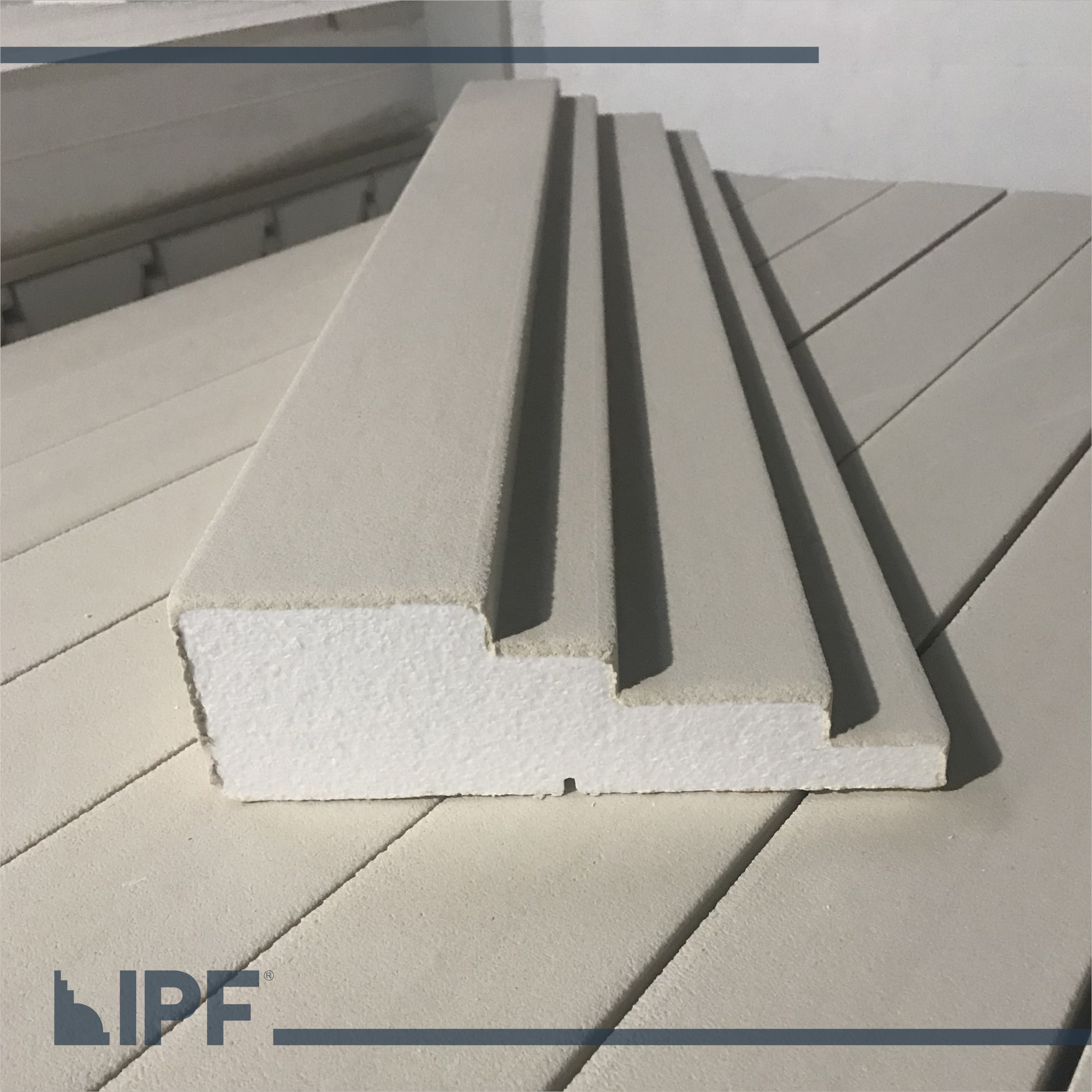 Moldura com base em EPS (isopor) revestida com a massa acrílica flexível exclusiva da IPF, são peças resistentes ao tempo e a propagação de fogo, próprias para ambientes externos e internos.