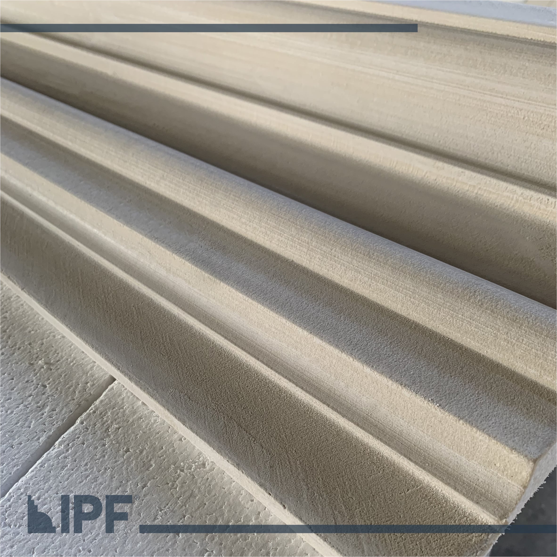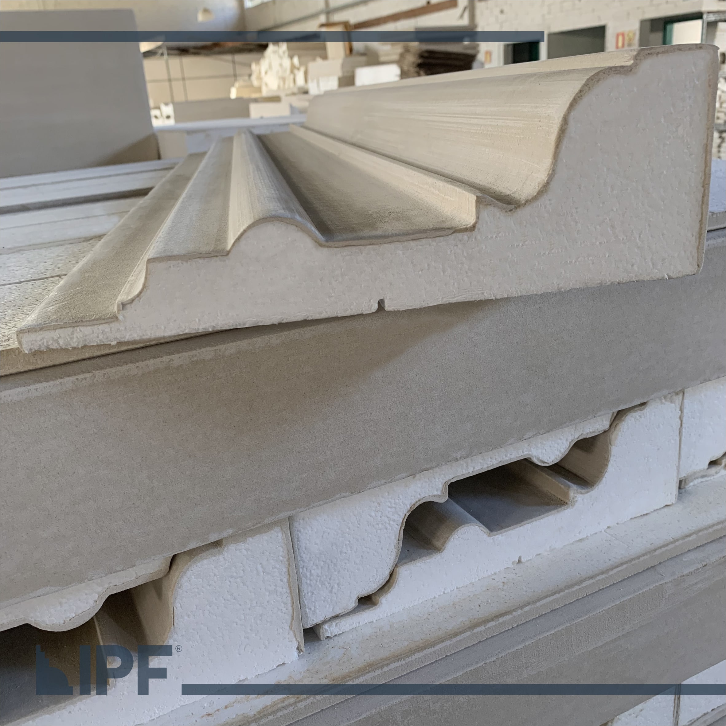 Moldura com base em EPS (isopor) revestida com a massa acrílica flexível exclusiva da IPF, são peças resistentes ao tempo e a propagação de fogo, próprias para ambientes externos e internos.