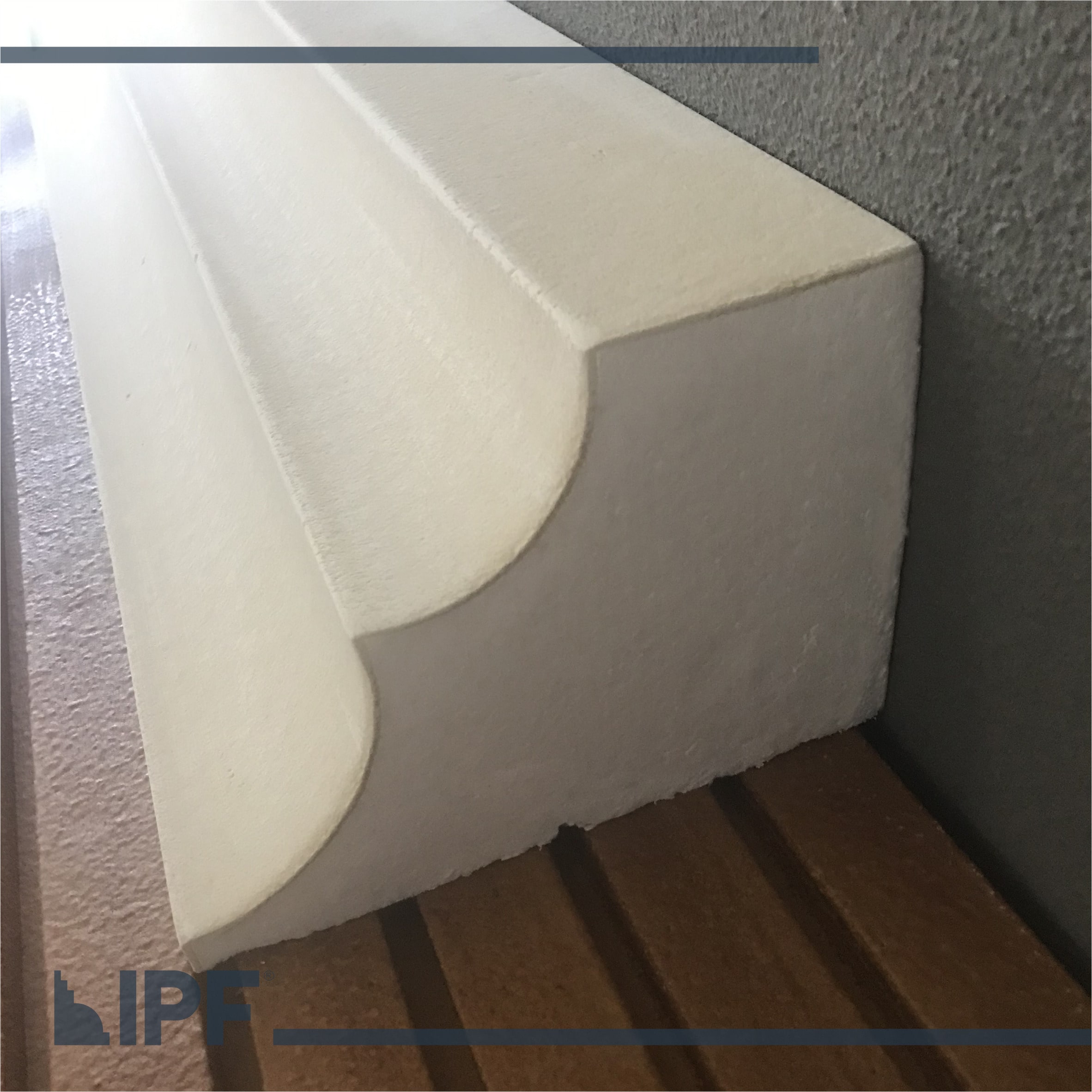 Moldura com base em EPS (isopor) revestida com a massa acrílica flexível exclusiva da IPF, são peças resistentes ao tempo e a propagação de fogo, próprias para ambientes externos e internos.