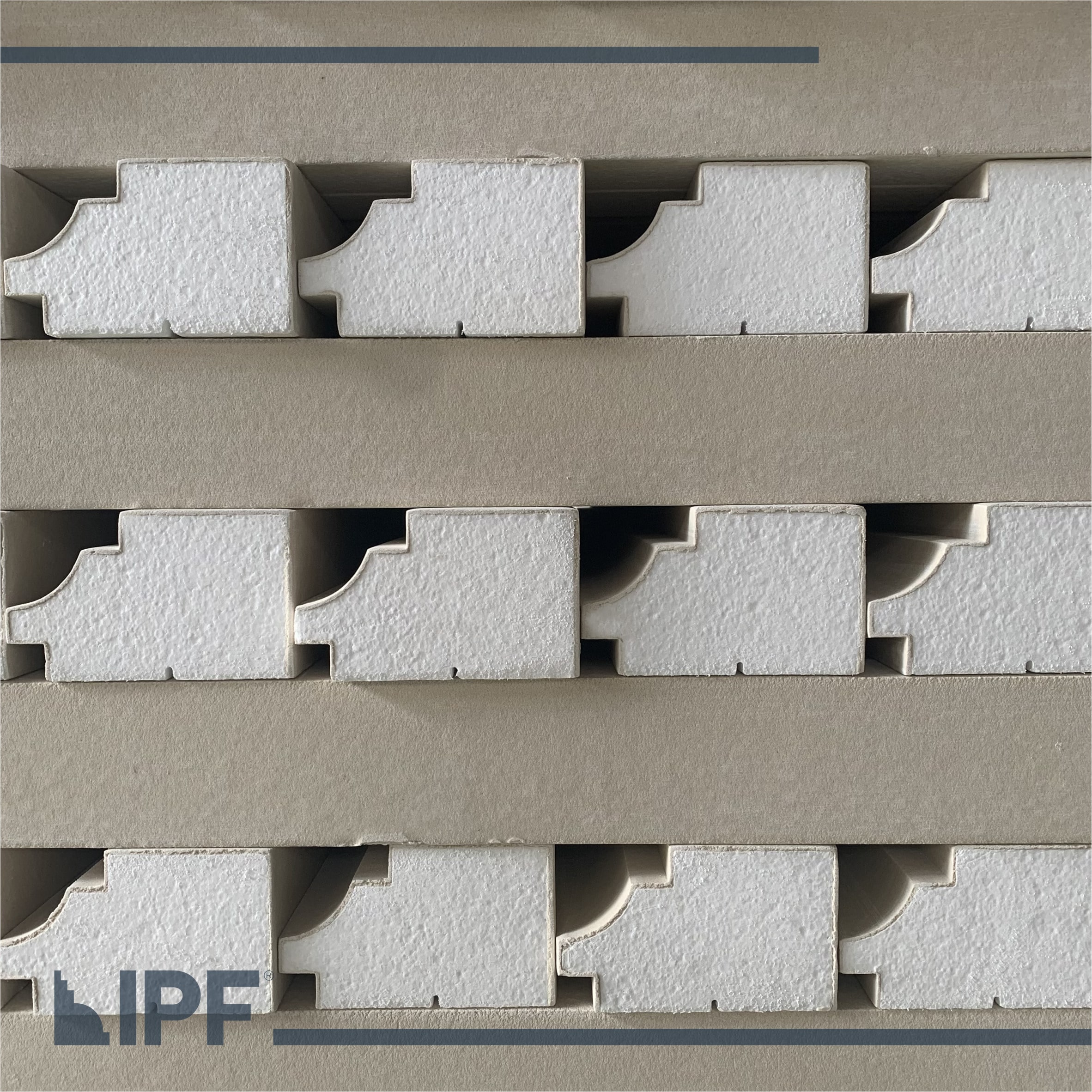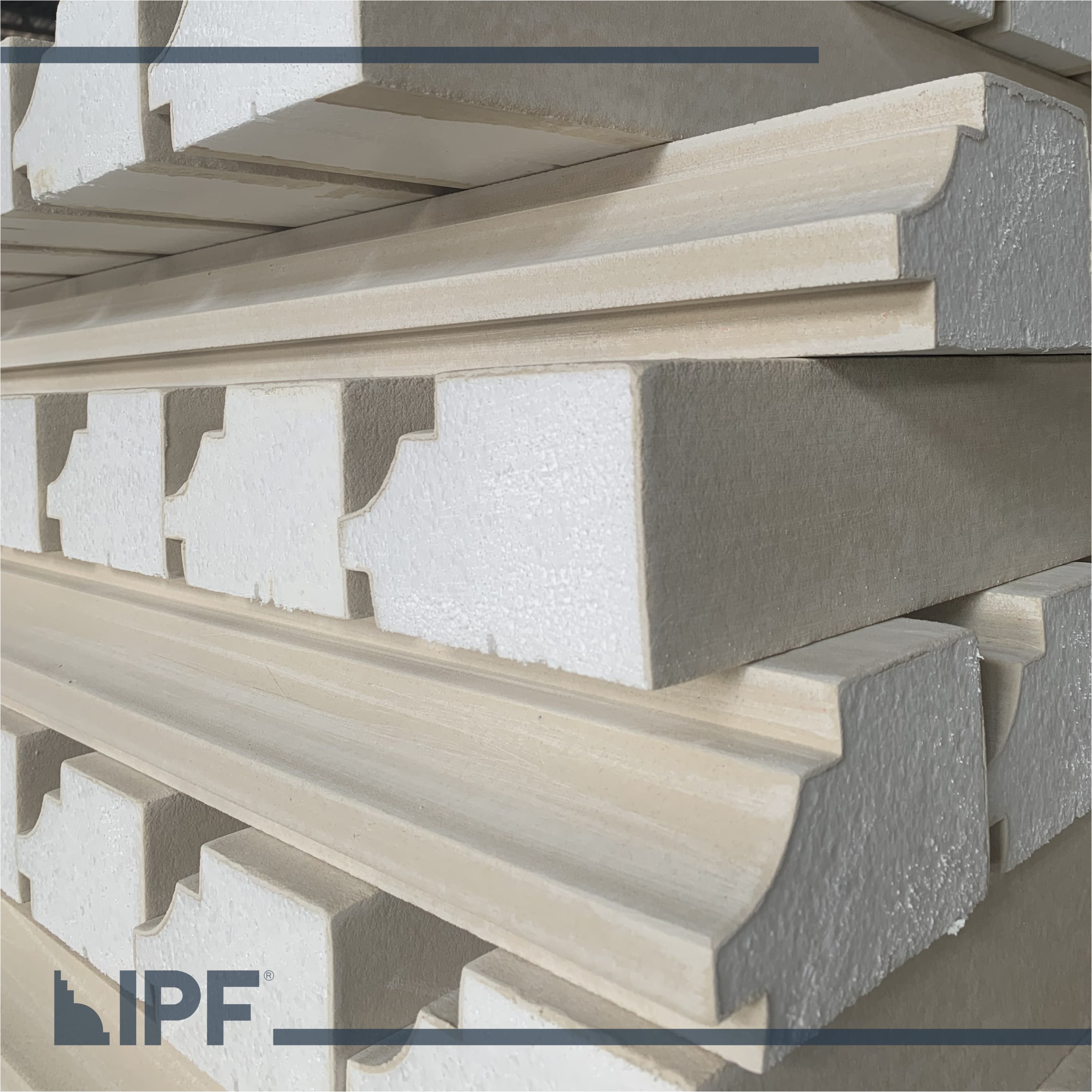 Moldura com base em EPS (isopor) revestida com a massa acrílica flexível exclusiva da IPF, são peças resistentes ao tempo e a propagação de fogo, próprias para ambientes externos e internos.