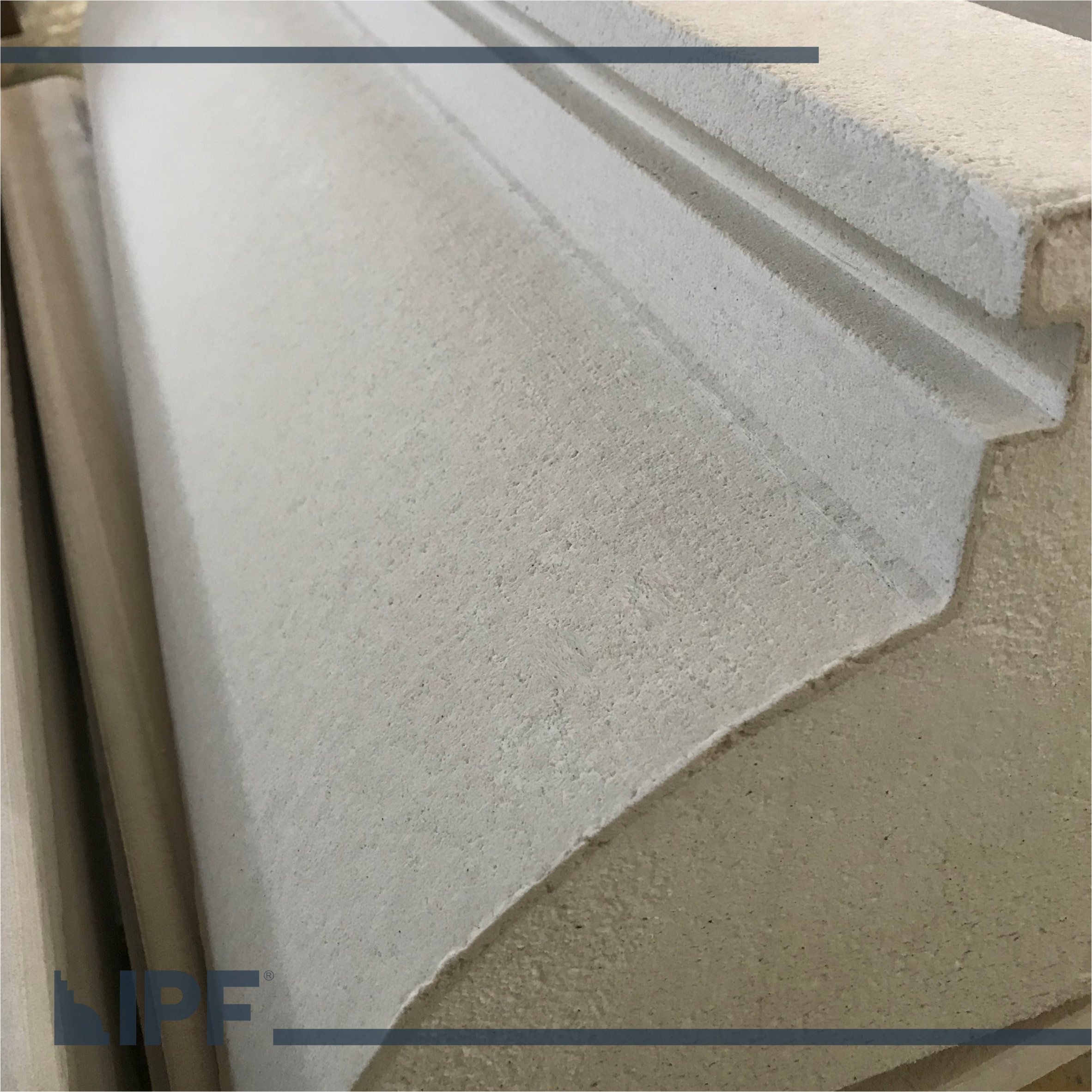 Moldura com base em EPS (isopor) revestida com a massa acrílica flexível exclusiva da IPF, são peças resistentes ao tempo e a propagação de fogo, próprias para ambientes externos e internos.