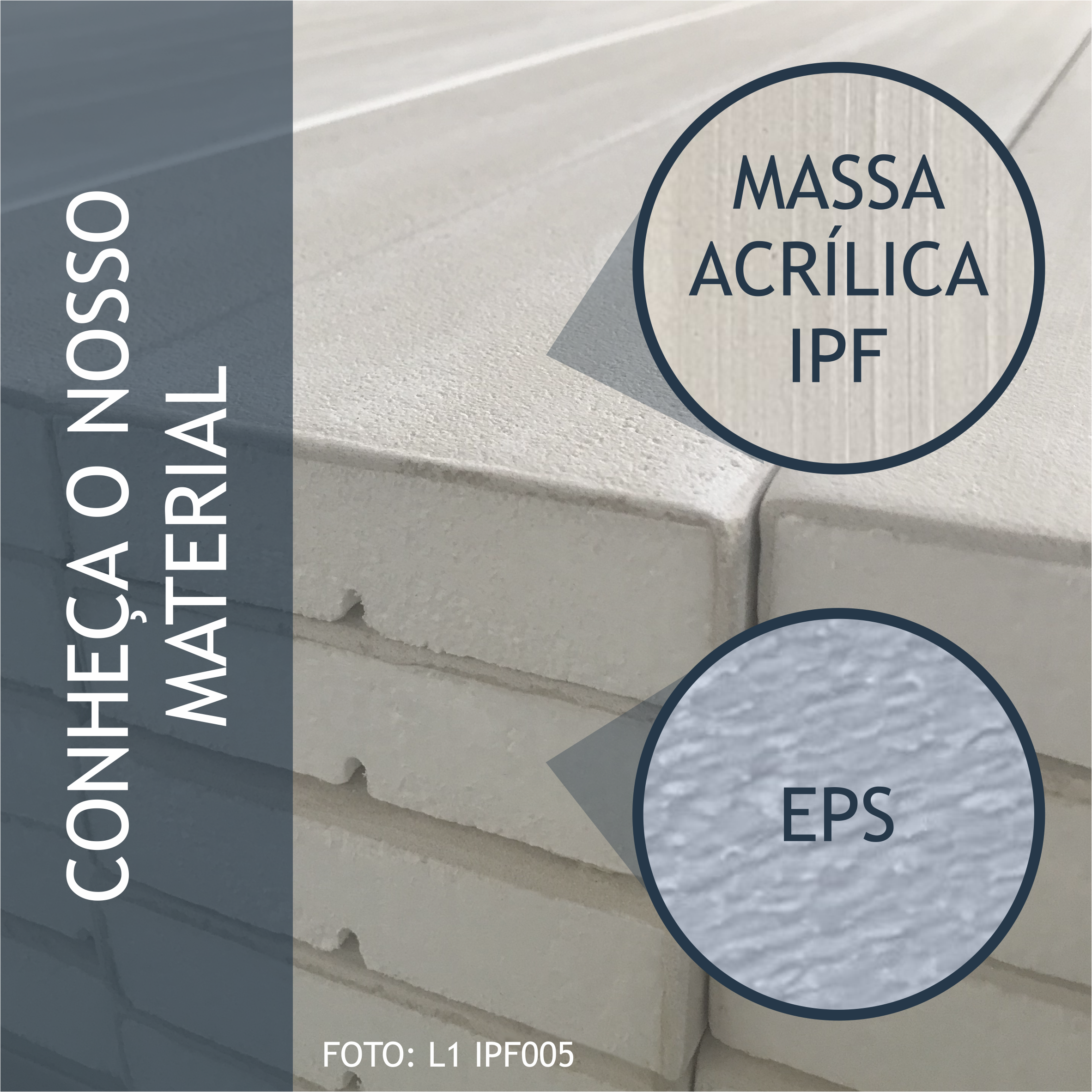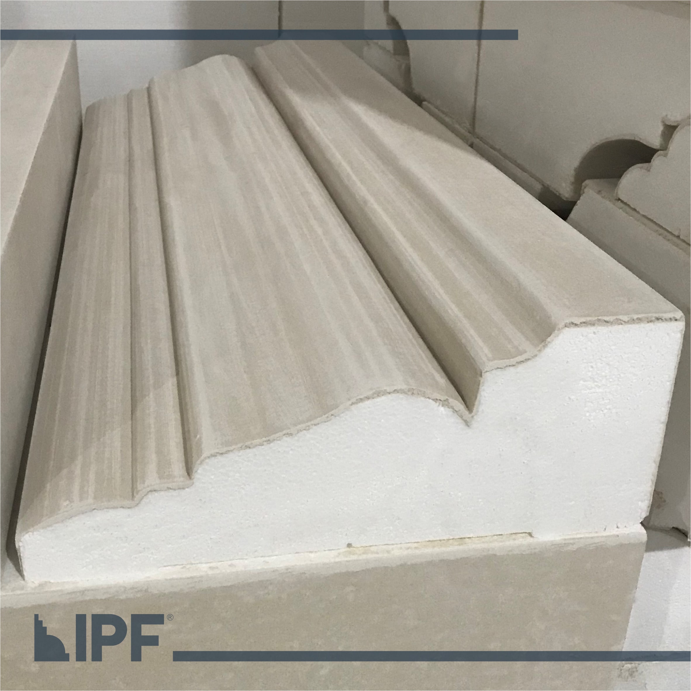 Moldura com base em EPS (isopor) revestida com a massa acrílica flexível exclusiva da IPF, são peças resistentes ao tempo e a propagação de fogo, próprias para ambientes externos e internos.