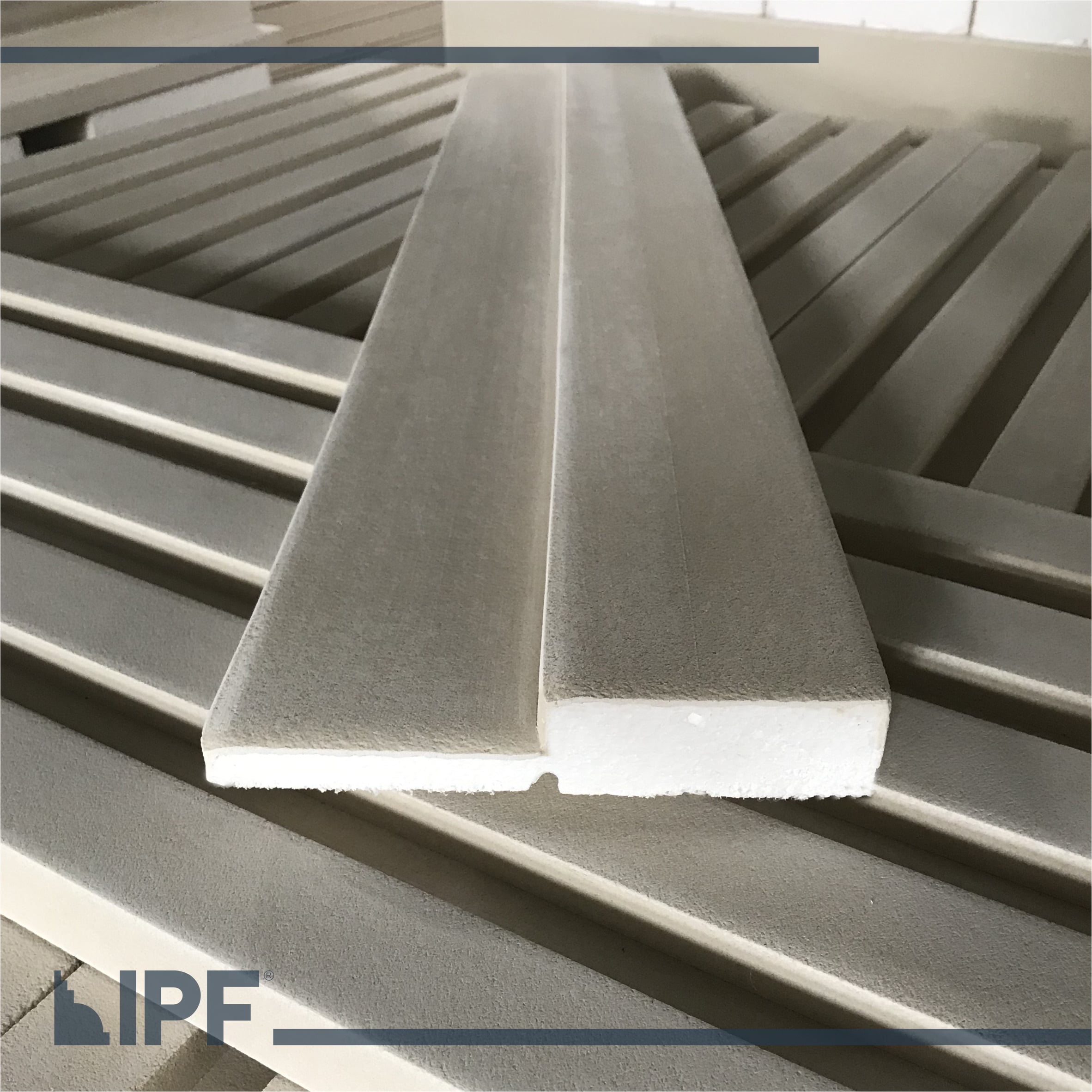 Moldura com base em EPS (isopor) revestida com a massa acrílica flexível exclusiva da IPF, são peças resistentes ao tempo e a propagação de fogo, próprias para ambientes externos e internos.