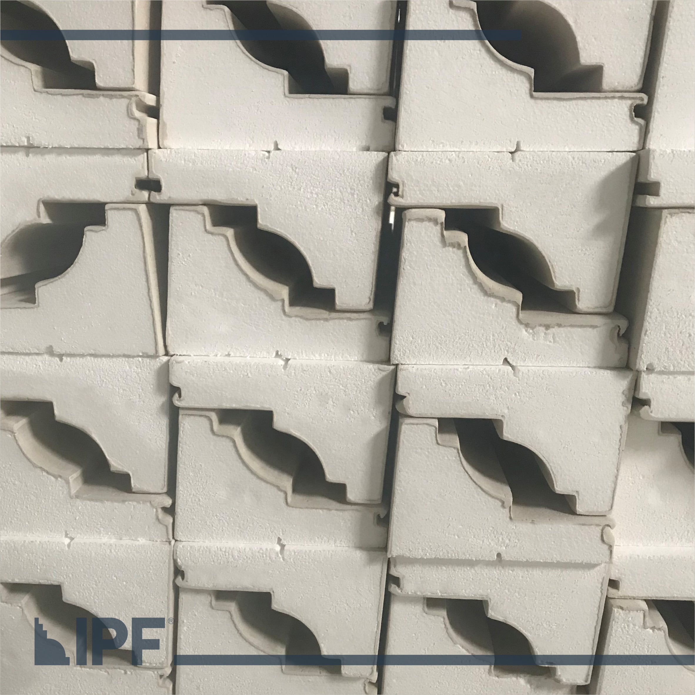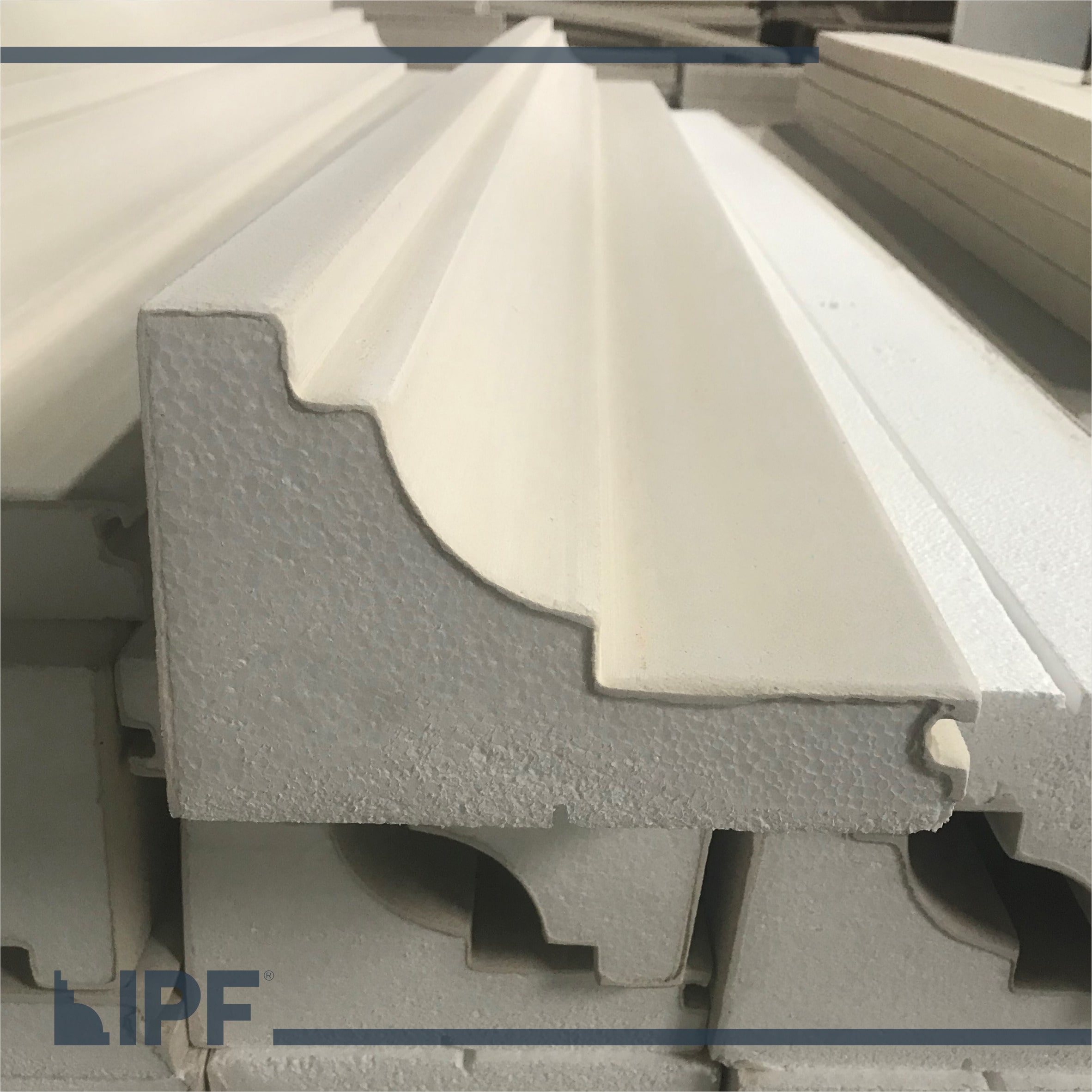 Moldura com base em EPS (isopor) revestida com a massa acrílica flexível exclusiva da IPF, são peças resistentes ao tempo e a propagação de fogo, próprias para ambientes externos e internos.