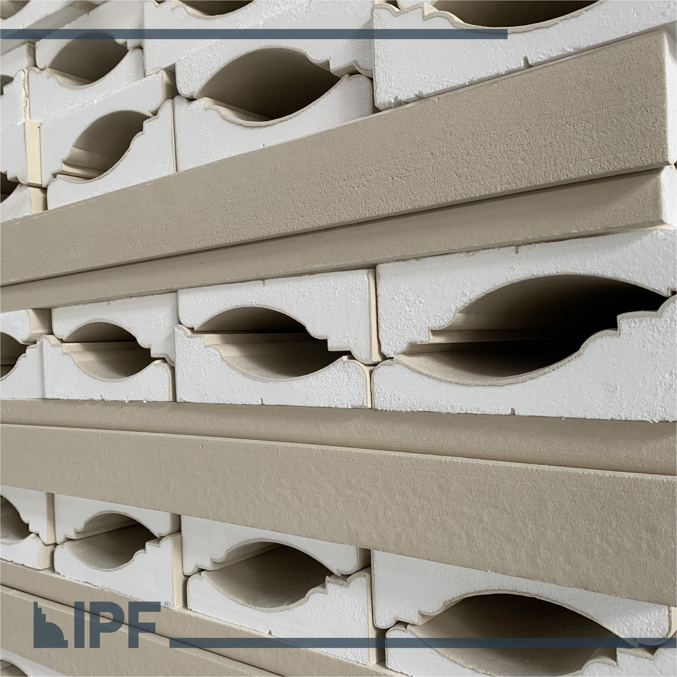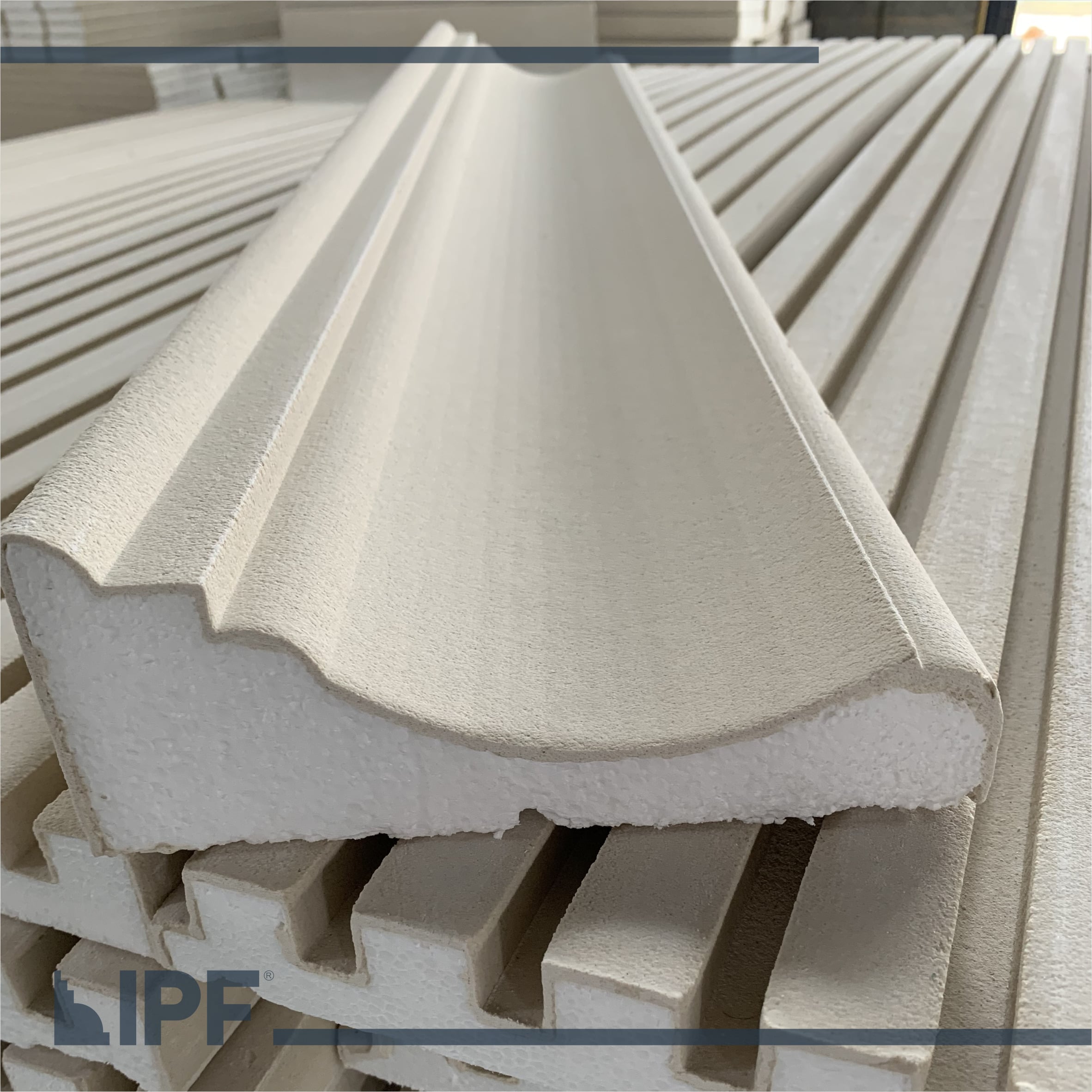 Moldura com base em EPS (isopor) revestida com a massa acrílica flexível exclusiva da IPF, são peças resistentes ao tempo e a propagação de fogo, próprias para ambientes externos e internos.