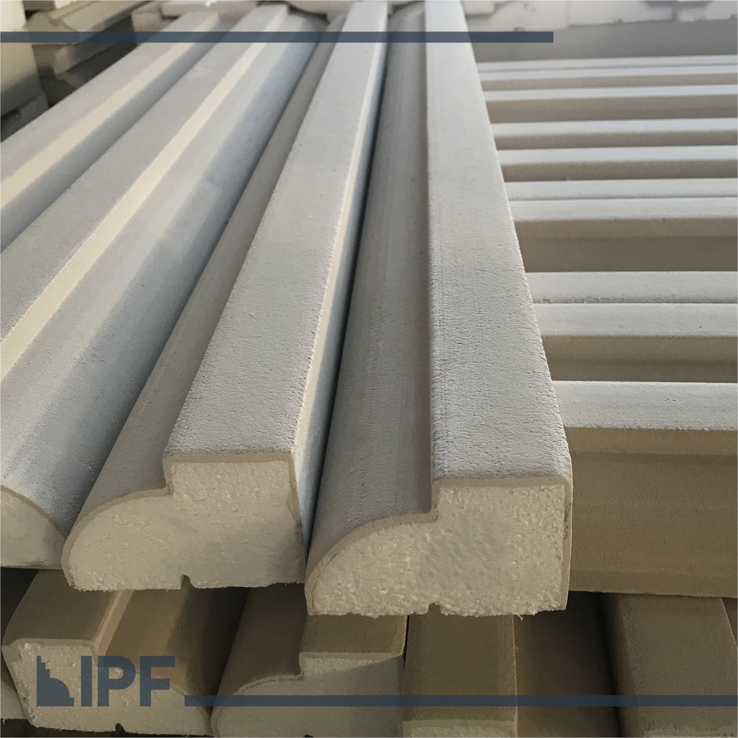Moldura com base em EPS (isopor) revestida com a massa acrílica flexível exclusiva da IPF, são peças resistentes ao tempo e a propagação de fogo, próprias para ambientes externos e internos.