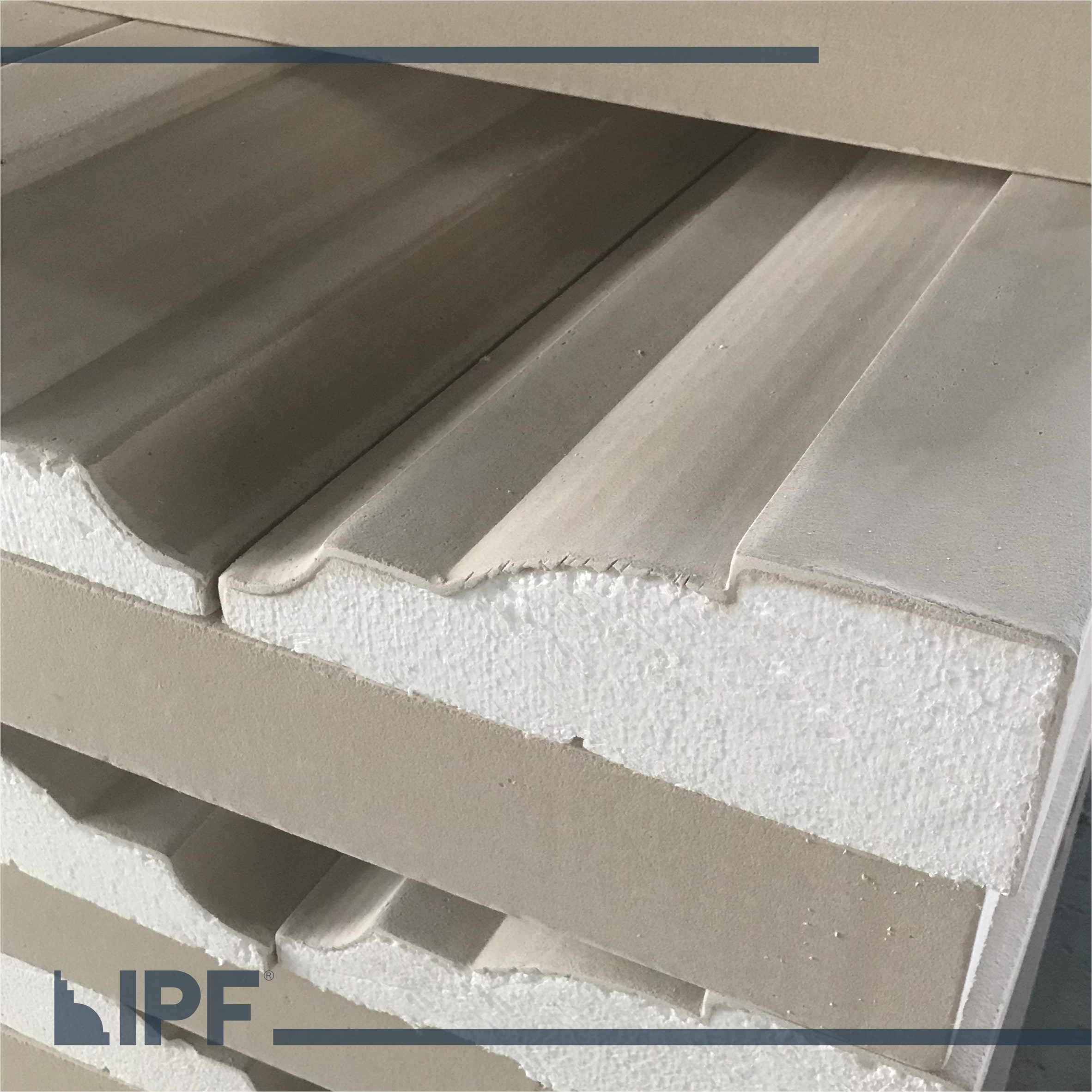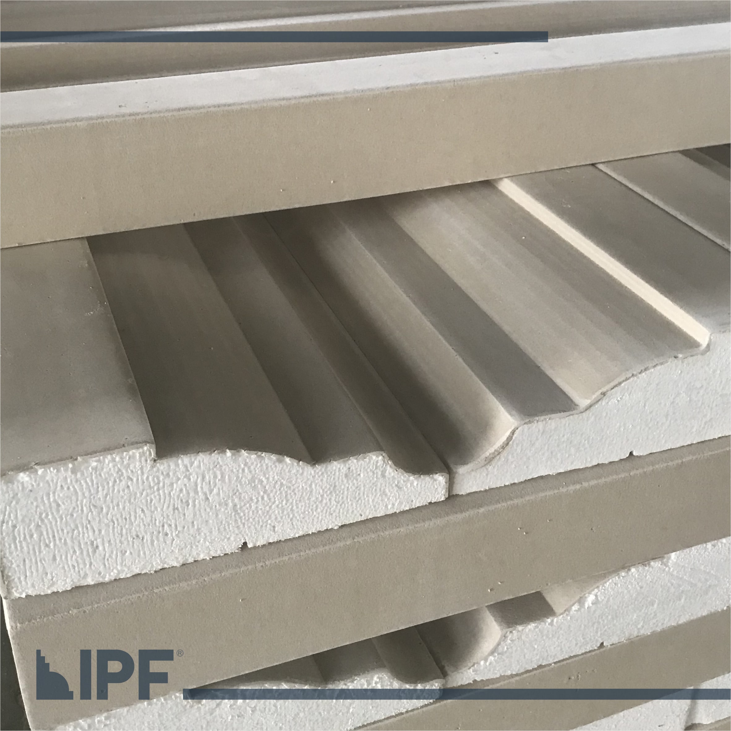 Moldura com base em EPS (isopor) revestida com a massa acrílica flexível exclusiva da IPF, são peças resistentes ao tempo e a propagação de fogo, próprias para ambientes externos e internos.