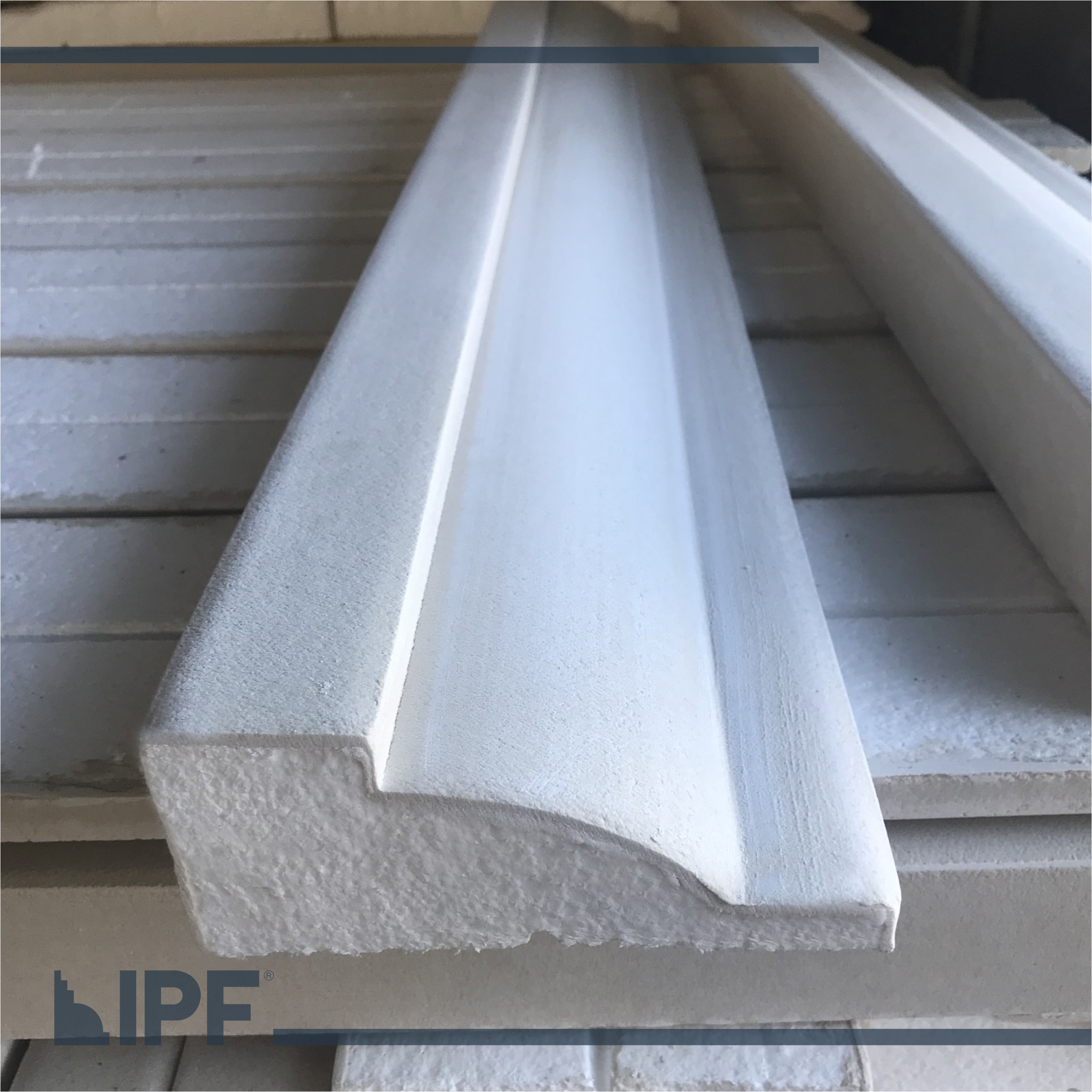 Moldura com base em EPS (isopor) revestida com a massa acrílica flexível exclusiva da IPF, são peças resistentes ao tempo e a propagação de fogo, próprias para ambientes externos e internos.